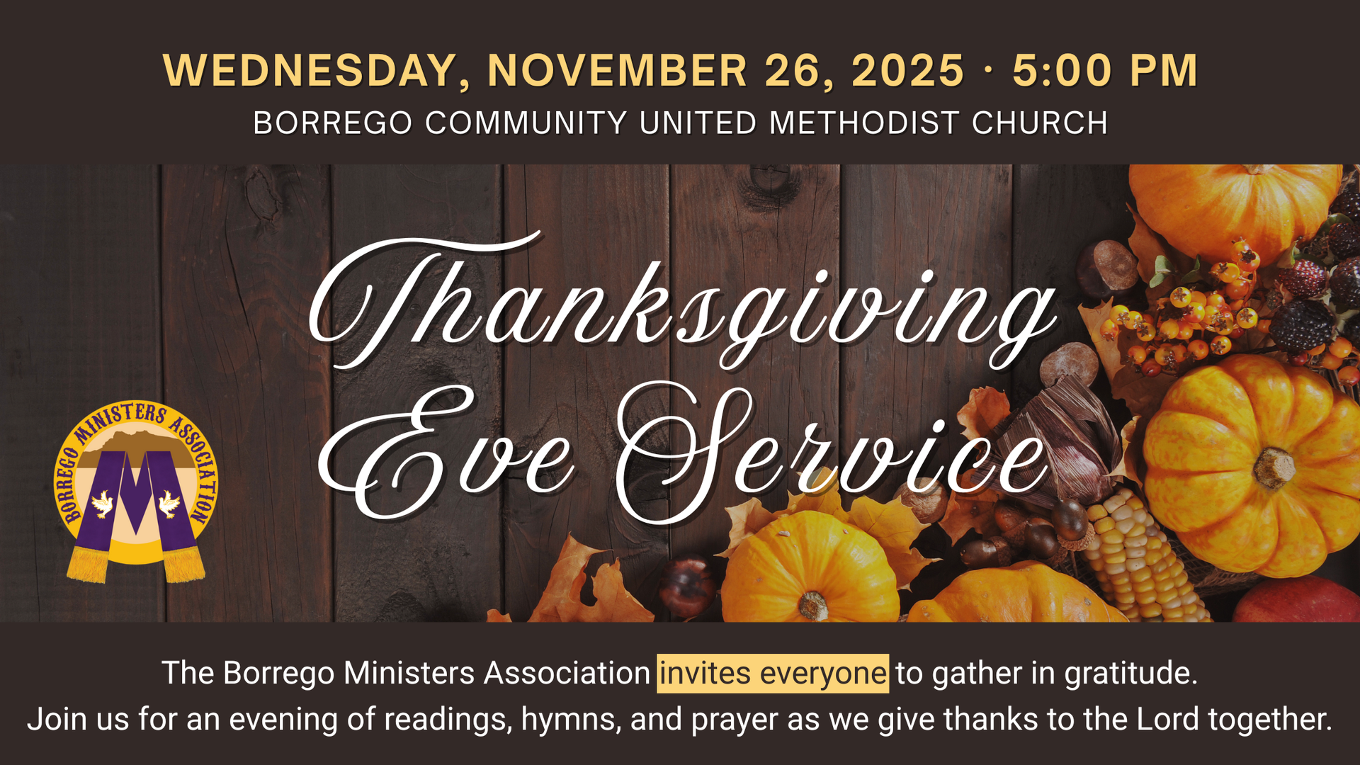 The Borrego Ministers Association invites everyone to a Thanksgiving Eve Service at Borrego Community United Methodist Church on Wednesday, November 26, 2025, at 5:00 PM. 633 Church Ln, Borrego Springs, CA 92004