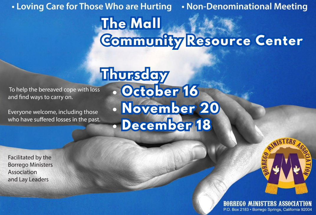 The Borrego Ministers Association offers a Grief and Loss Support Group for anyone coping with loss. Whether your grief is recent or long-standing, this group provides a compassionate, non-denominational space to share, listen, and heal alongside others in the community.