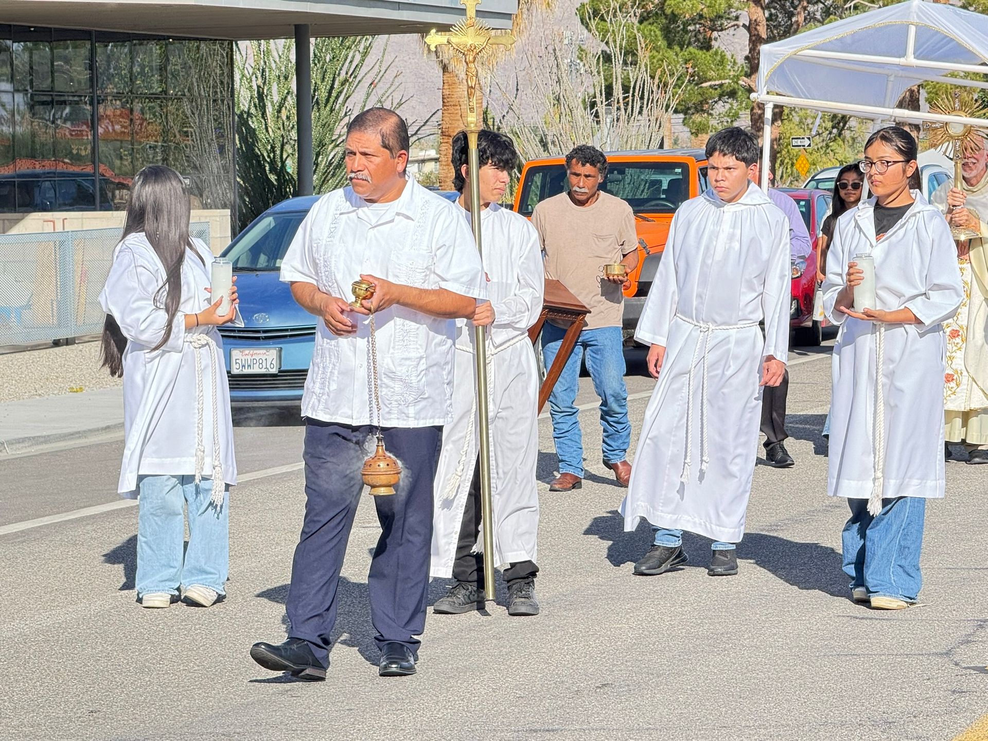 Borrego Springs marked the annual Guadalupe Procession on Saturday, December 13, as community members gathered for prayer, music, and a public walk led by Fr. Anthony “Tony” Stanonik of St. Richard’s Catholic Church. The route began at Christmas Circle, continued past the Borrego Art Institute and the Borrego Springs Post Office, and concluded at St. Richard’s Catholic Church.